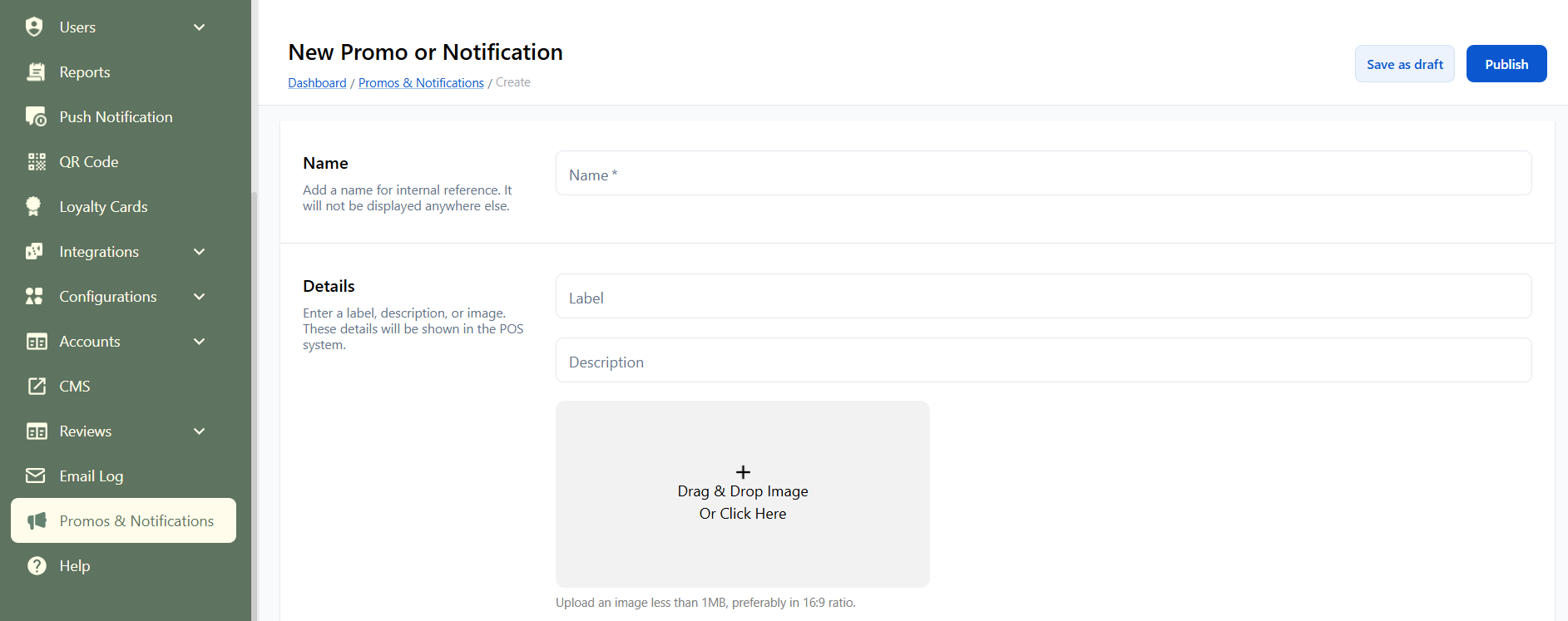 - Name: Used to identify the promotion/notification within the Admin Panel. (Not displayed in the POS App)